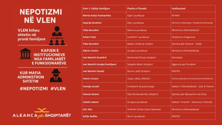 Aleanca për Shqiptarët përmes një reagimi theksojnë se shprehin shqetësimin e thellë për fenomenin e shndërruar në praktikë qeverisëse nga koalicioni VLEN – nepotizmin masiv dhe kapjen e institucioneve nga familjarët e funksionarëve të tyre politikë