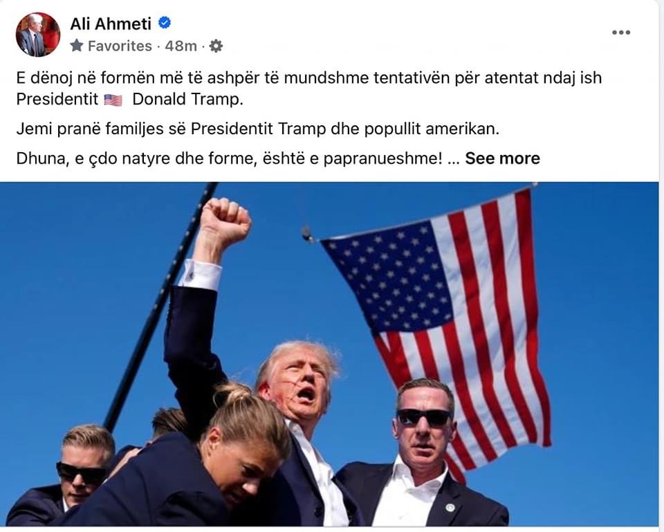 Lideri i Bashkimit Demokratik për Integrim, z. Ali Ahmeti, ka reaguar në rrjetet sociale për sulmin ndaj ish Presidentit Amerikan Donald Tramp.