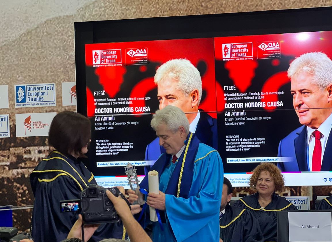 Kryetari i Bashkimit Demokratik për Integrim (BDI), Ali Ahmeti, është nderuar sot nga Universiteti Europian i Tiranës (UET) me titullin e lartë akademik “Doctor Honoris Causa”.