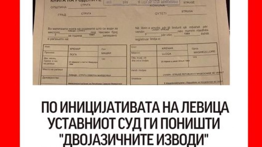 “Ministri i Drejtësisë, Krenar Lloga, përmes këtij akti ka tentuar të fusë dygjuhësinë dhe rubrikën për “kombësi” në certifikatat e reja të lindjes, në kundërshtim me të gjitha praktikat civilizuese dhe me qëllim të ndarjes së popullatës në Republikën e Maqedonisë”, thonë nga “E Majta”.