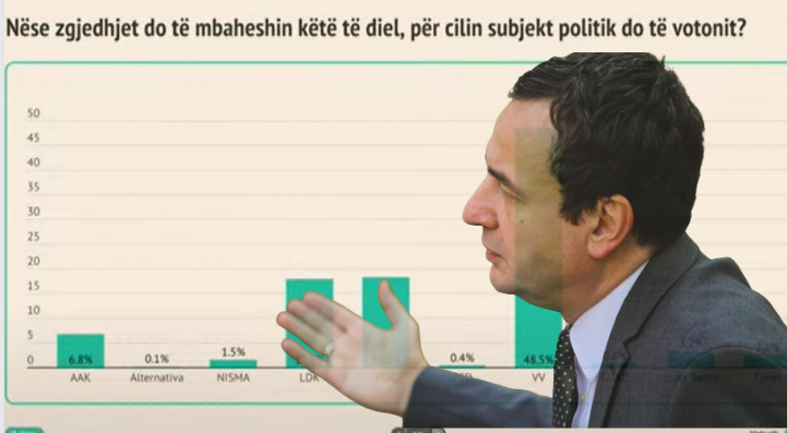 Sipas sondazhit të UBO Consulting, Lëvizja Vetëvendosje (LVV) kryeson në vend të parë me 48.5 për qind ndërsa partia e dytë që është listuar me 18.2 për qind është Partia Demokratike e Kosovës (PDK).