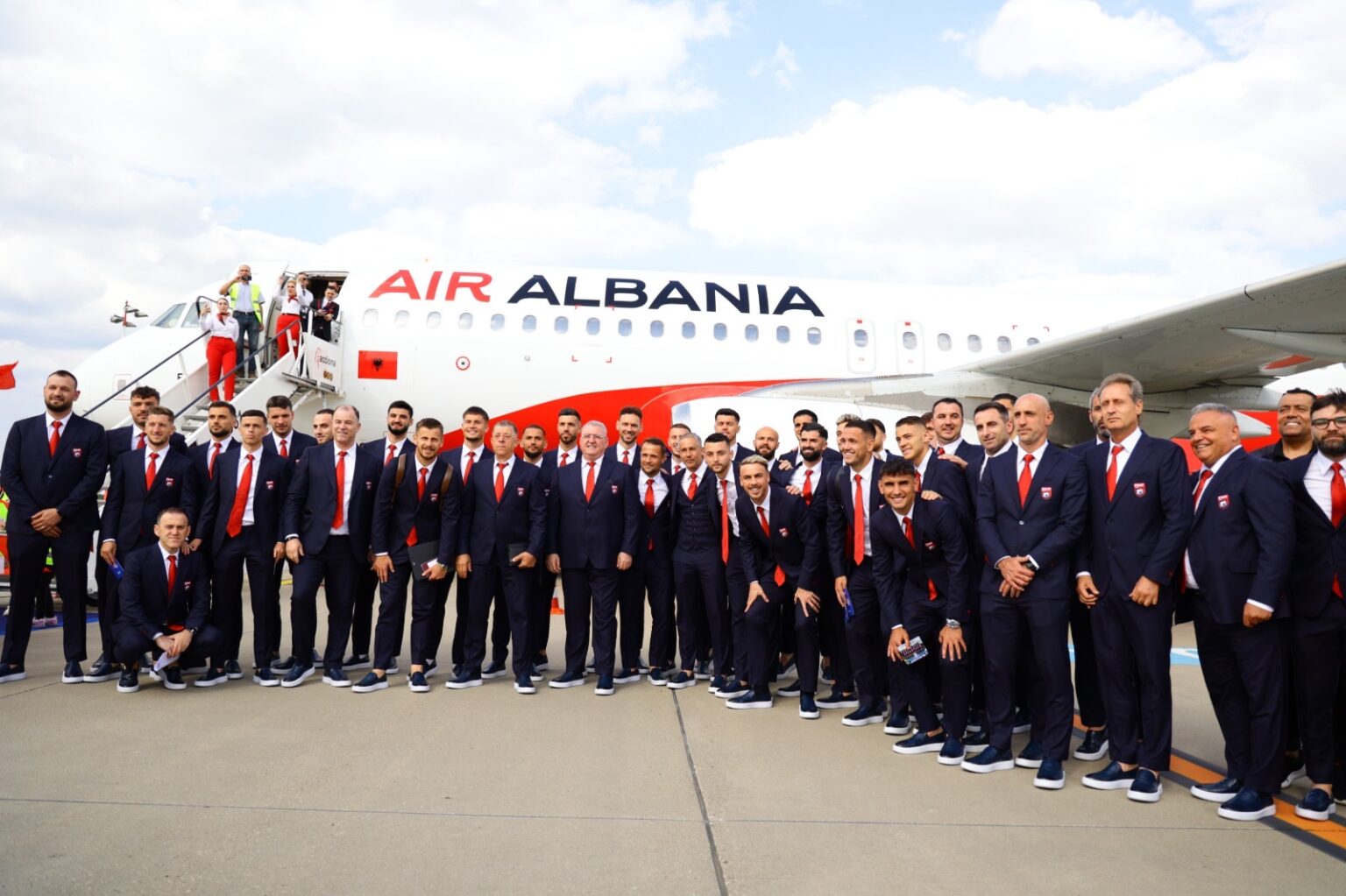 Ambasadorja e Shqipërisë në Gjermani, Adia Sakiqi, zyrtarë të UEFA-s, përfaqësues të lartë të aeroportit, por edhe disa fëmijë nga komuniteti shqiptar në Dusseldorf, mirëpritën të parët Kombëtaren Shqiptare, duke i uruar mirëseardhje dhe suksese në Kampionatin Europian.