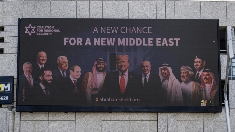 Një poster i madh që tregon udhëheqësit e Arabisë Saudite, Sirisë, Omanit dhe Libanit, vende të cilat nuk kanë marrëdhënie diplomatike me Izraelin, krah për krah me presidentin e SHBA-së, Donald Trump dhe kryeministrin izraelit, Benjamin Netanyahu u vendos në një tabelë reklamash në një pjesë qendrore të Tel Avivit.