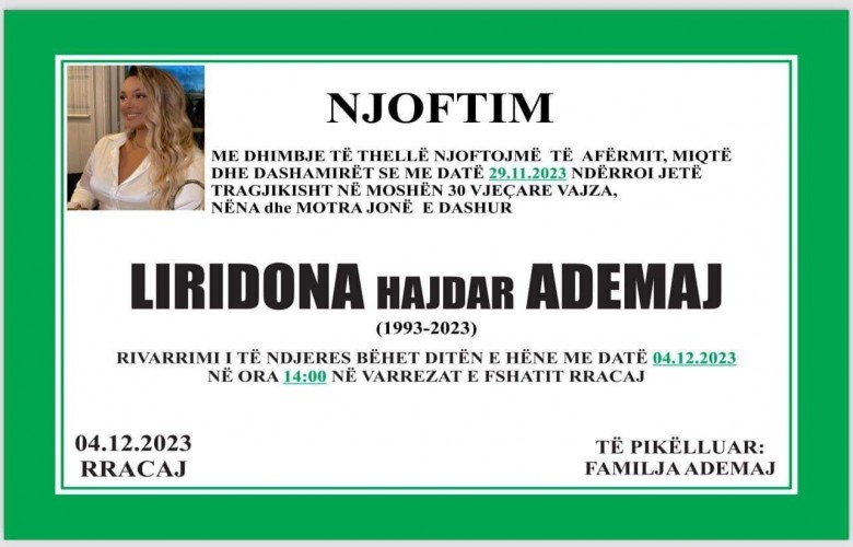 “Njoftim mortor nga familja Ademaj. Familja Ademaj njofton miq, shokë e dashamir se rivarrimi i vajzës tonë Liridona Ademaj e vrarë me datën 29.11.2023 bëhet me datë 4 dhjetor 2023 në varrezat e fshatit Rracaj në ora 14:00”, thuhet në njoftimin e faqen e fshatit Rracaj.
